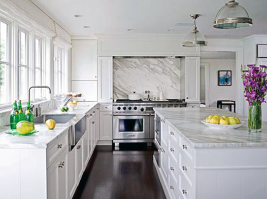 Clean kitchen design with white shaker cabinets paired with polished black granite countertops and white subway tile backsplash. Recessed lighting throughout kitchen ceiling and chocolate stained hard wood oak floors make a stunning statement. Contemporary White Kitchen With a Waterfall-Style Calacatta Marble Island. Clean and contemporary describe this beautifully composed open-concept kitchen. And then there's the regal look of all-white cabinets and countertops with only dark wood floors to contrast it, or the more subdued look of... Tired of seeing nothing but white kitchens? Here are 10 that my readers submitted that are anything but! Karen's is a combination of