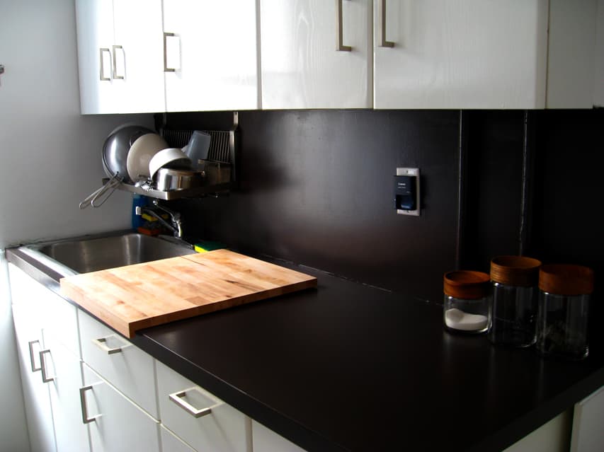 Painting kitchen countertops black can create a dramatic contrast in a white kitchen or when surrounded by a bank of wood cabinets. If you simply want to restore or change up the wooden counters, then a few coats of colored stain can create a warm tone to a bland expanse of butcher... I experimented with countertop paint in my kitchen. See step by step what this $20 does in this DIY tutorial, and see what it looks like now! I first heard that painting laminate countertops was possible after reading this post from Brooklyn Limestone. Plastic laminate kitchen countertop before