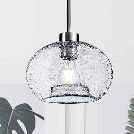 The unique, curved lines and subtle details of this hammered glass pendant give it a versatile style. With a dome at 9.25-inches in diameter and 9.5-inches tall, it's the perfect size for over a sink, kitchen bar counter, or island in multiples, with a recommended 60-watt bulb for optimal illumination. Buying guide for best under-cabinet lighting. If there was ever a place in the house that needed extra light, it's the shaded areas beneath the cabinets. Any time you're looking under the cabinets, you're standing between the ceiling light and the area beneath the cabinets, plunging them further into shade.